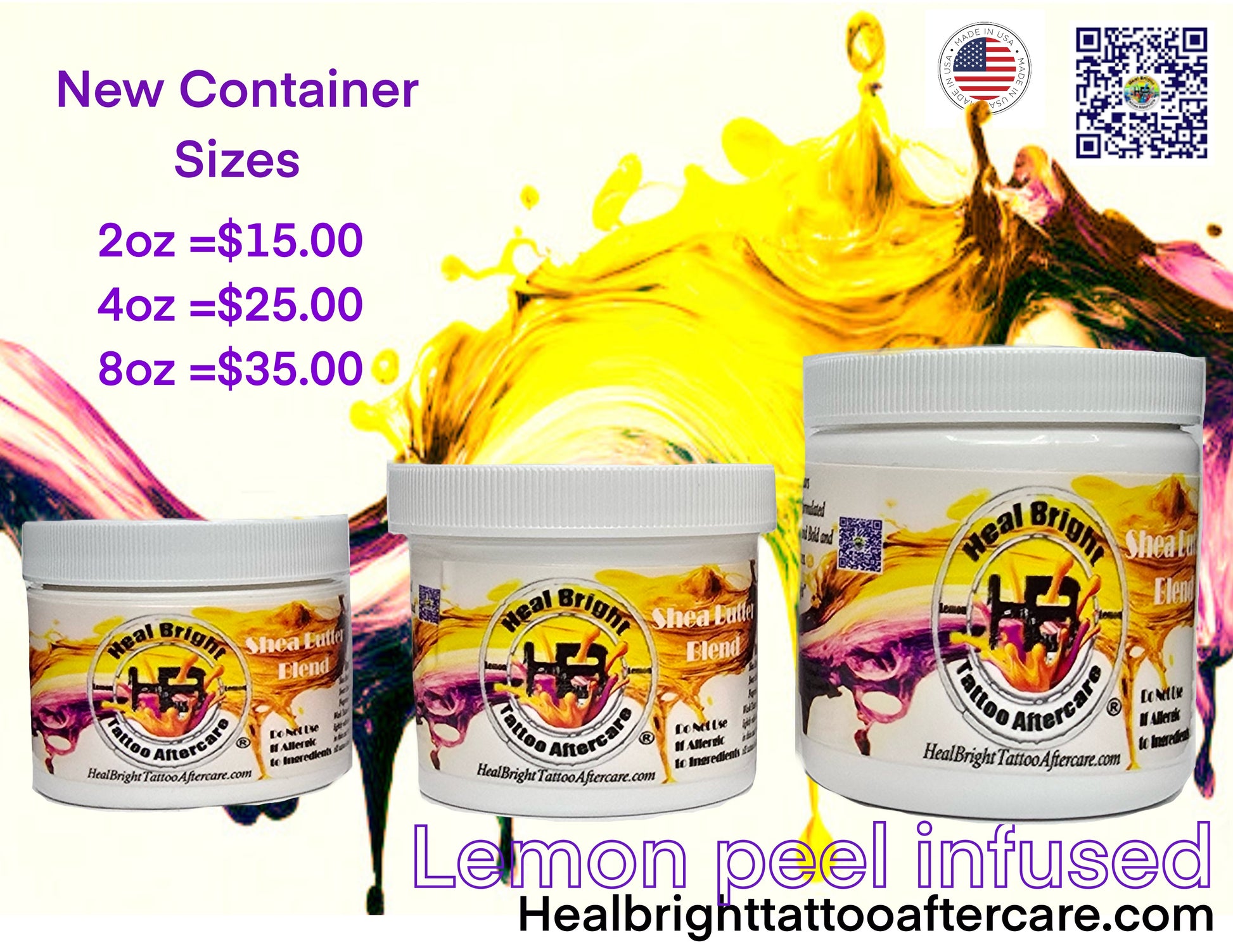 Use our Lemon Butter to heal your tattoos while eliminating unwanted and unseen issues with ingrown hairs, and scaring, Lemons are great to eliminate scaring in new and old tattoos, they help with anything regarding the skin, including stretchmarks. This butter has been developed to heal Tattoos, and also to speed up the healing process, shorter heal time equals brighter and bold tattoos. Great for dry skin, this butter not only smells great it also heals tattoos great as well. Small amounts of this butter spreads nicely. Make sure not to over saturate, rub the butter completely into skin, and remember shiny is bad... Ingredients, Shea butter, Lemon Peel, Jojoba oil, Rice Bran oil Sweet almond oil, olive oil, Fragrance oil, Preservative